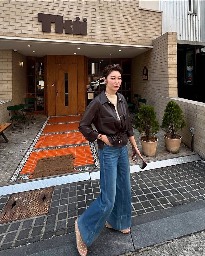 데님 와이드 팬츠와 블랙 레더 셔츠를 매치한 변정수는 편안하면서도 스타일리시한 캐주얼 룩을 선보였다. 와이드 팬츠의 넉넉한 실루엣은 자유로운 움직임을 가능하게 하며, 도트 패턴의 플랫폼 샌들은 룩에 포인트를 준다. 이 조합은 일상적인 외출에도 적합한 실용적인 스타일이다.
