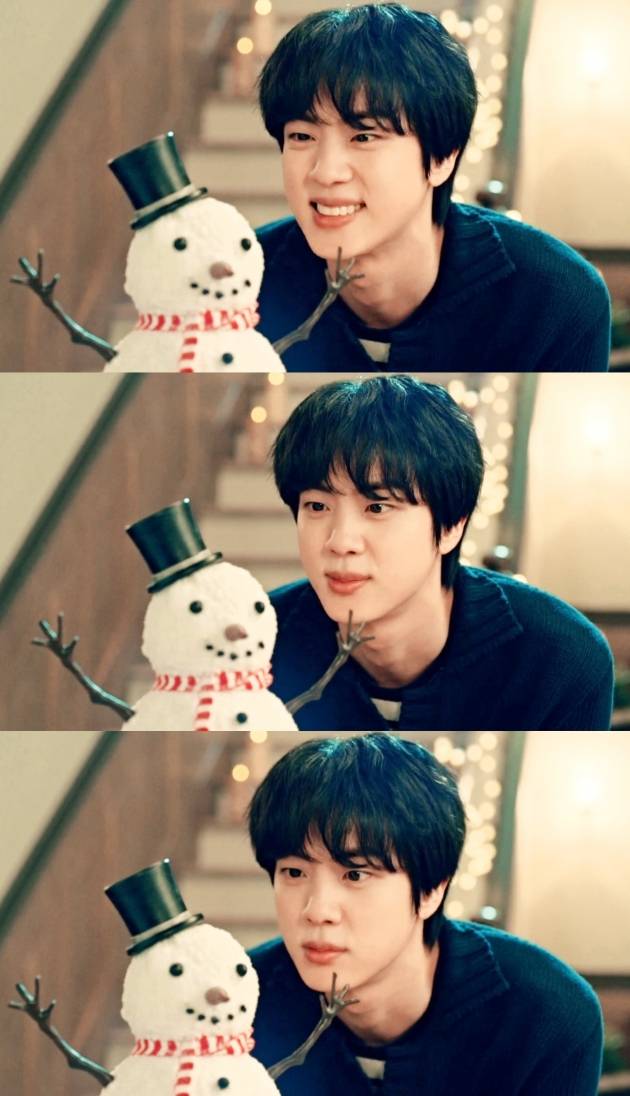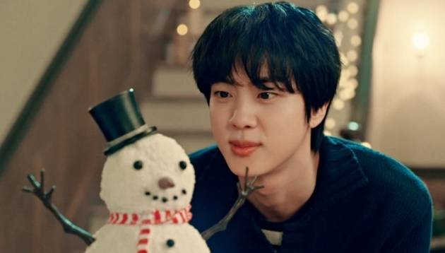 진은 깔끔하고 세련된 네이비 니트를 입고 작은 눈사람 인형을 바라보며 입꼬리가 볼에 낀 진 특유의 사랑스러운 미소로 영상의 마지막을 장식했다.