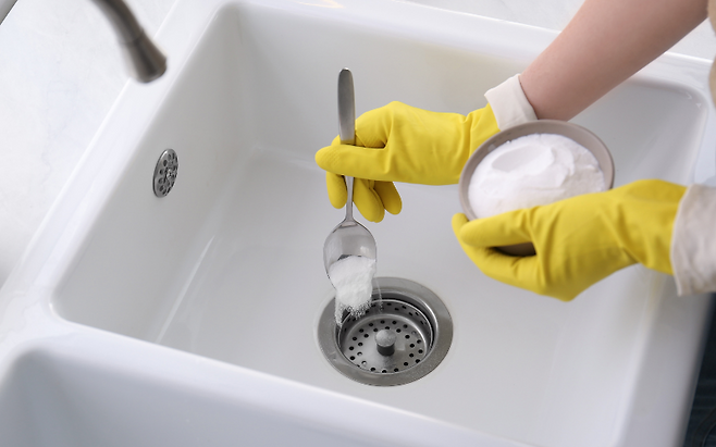 먼저 베이킹소다 4~5스푼을 배수구 안쪽에 골고루 뿌립니다. 그다음 식초 한 컵을 천천히 부어주면 거품이 발생하며 배수구 안의 찌든 때와 세균을 분해합니다.