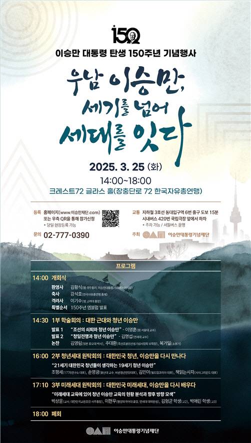 이승만대통령 기념재단은 오는 25일 오후 2시 서울 중구 장충단로 '크레스트72 글라스홀'(장충단로 한국자유총연맹)에서 이승만 대통령 탄생 150주년 기념행사 '우남 이승만, 세기를 넘어 세대를 잇다'를 개최한다.