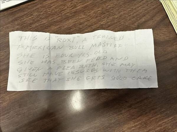 해당 쪽지에는 "이 개는 훈련된 아메리칸 불마스티프 록시입니다", "녀석은 4살이고 보살핌을 잘 받게 해 주세요"등의 글이 적혀있었습니다.