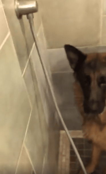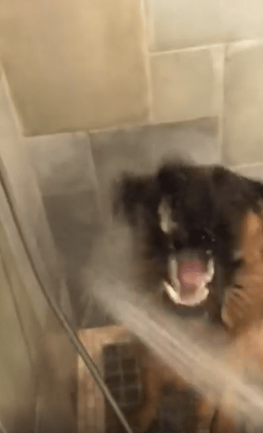 하지만 시선이 반대편으로 옮겨지자 분위기는 완전히 달라집니다. 이번엔 저먼 셰퍼드. 같은 물줄기, 같은 위치지만 반응은 180도 다릅니다. 물이 얼굴 근처에 닿는 순간, 셰퍼드는 눈을 번쩍 뜨고 얼굴을 좌우로 격하게 흔듭니다. 입을 크게 벌려 마치 물을 향해 싸우듯 달려들죠. 마구 깨무는 듯한 동작과 물줄기를 박살내려는 듯한 그 기세—그야말로 "물과의 한판 승부"였습니다.