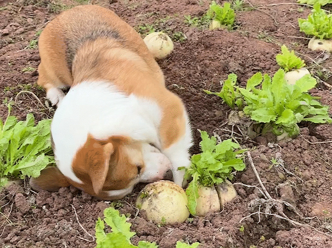 밭으로 나가자마자 엉덩이를 흔들며 고구마를 캐고, 귀를 실룩이며 무도 뽑는 웰시코기, 그 모습이 꼭 농사꾼 같았거든요. 얼굴에 진흙 범벅이 되도록 땅을 파는 모습에, 마을 사람들 사이에선 어느새 “땅 파기 전문가”라는 별명이 생겼어요.