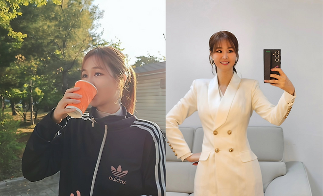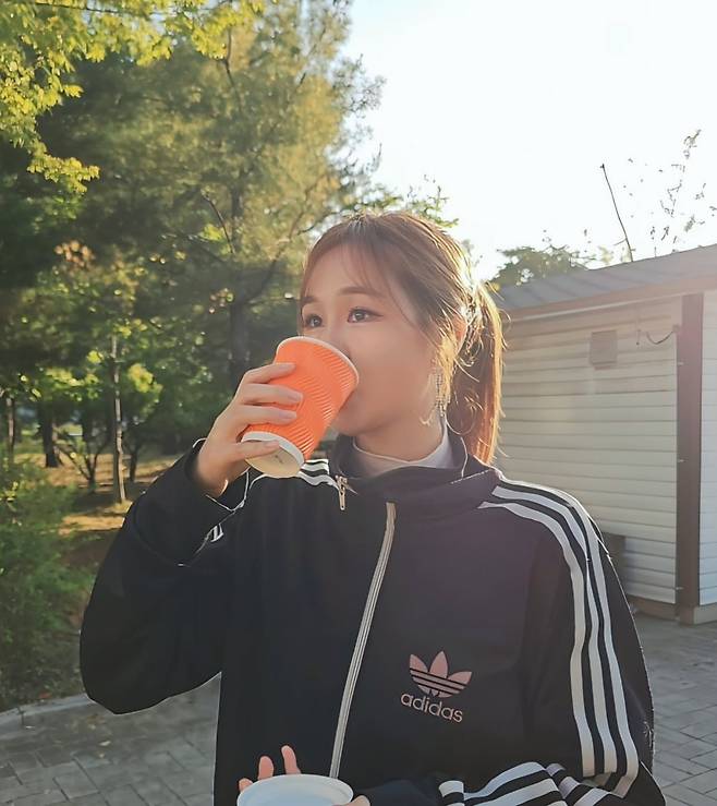 첫 번째 사진에서는 아디다스 트랙 재킷을 착용한 스포티한 룩을 선보이고 있다. 클래식한 블랙 컬러의 아디다스 트랙 재킷에 상징적인 세 줄 디자인이 돋보이며, 핑크 로고가 여성스러운 포인트를 더하고 있다. 자연 속에서 오렌지 컬러의 테이크아웃 컵을 들고 있는 모습이 캐주얼하면서도 생기 넘치는 분위기를 자아내고 있다. 단정하게 묶은 포니테일 헤어스타일은 활동적인 이미지를 완성하며 일상 속 스포츠 캐주얼 스타일의 좋은 예시를 보여주고 있다.