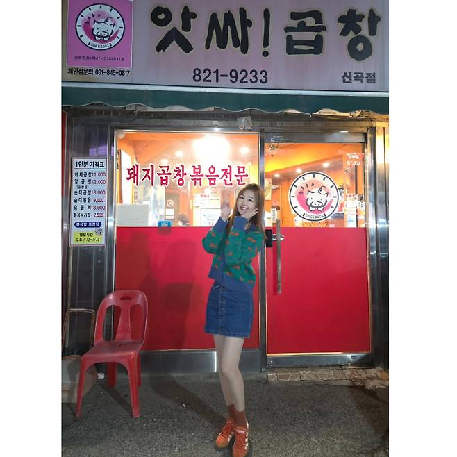 두 번째 사진에서 윤수현은 그린 컬러의 패턴 카디건과 데님 스커트를 매치한 캐주얼한 스트리트 패션을 선보이고 있다. 레트로 감성이 느껴지는 그린 카디건은 화려한 패턴으로 시선을 사로잡으며, 짧은 데님 스커트와의 조화로 젊고 발랄한 분위기를 연출하고 있다. 오렌지 컬러의 스니커즈로 포인트를 주어 전체적인 룩에 생동감을 더했다. 이 패션은 '왓싸! 곱창' 식당 앞에서 촬영되어 일상 속 편안한 스타일링을 보여주고 있다.
