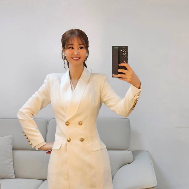 윤수현은 화이트 컬러의 테일러드 재킷을 입고 셀피를 찍는 모습으로 세련된 오피스 룩을 연출하고 있다. 골드 버튼 디테일이 돋보이는 화이트 재킷은 심플하면서도 고급스러운 느낌을 주며, 깔끔하게 정돈된 헤어스타일과 은은한 귀걸이로 포인트를 주었다. 미니멀한 메이크업으로 자연스러운 아름다움을 강조하면서도 프로페셔널한 이미지를 놓치지 않고 있다. 밝은 톤의 의상은 그녀의 밝고 화사한 이미지와 완벽하게 어우러져 세련된 패션 감각을 보여주고 있다.