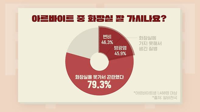 오래 전 설문조사이긴 하지만 2018년 알바천국에서 아르바이트생을 대상으로 "아르바이트 중 화장실 잘 가시나요?"라는 물음에 응답한 1,488명 중 79.3%가 근무 중 화장실을 못 가서 곤란했다고 답을 했다.