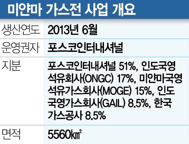 포스코인터는 2000년 미얀마 가스전 사업에 뛰어든 뒤 미얀마 2개 광구(A-1·A-3)에서 2004년 쉐, 2005년 쉐퓨, 2006년 미야 가스전을 발견했다. 이후 13년 만인 2013년 6월 처음으로 가스를 생산해 중국에 판매하기 시작했다.