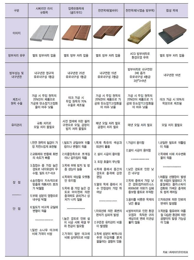A사의 관계자는 “데크재로 한때 방부목이 인기를 끌었다가 천연 목재에 자리를 내줬고, 지금은 합성 목재가 주류를 이루고 있다”면서 “하지만 합성 목재에 대한 단점이 부각되면서 세라믹(플라스틱), 석재, 알루미늄 등 다양한 데크재 소재들이 점차 소비자들의 눈길을 끌고 있다”고 말했다. 목재가 여전히 높은 선호도를 보이고 있으나 석재, 천연 미네랄, 세라믹 등 목재 외 다른 소재를 사용하는 데크재에 대한 관심이 높아지고 있다는 것이다. <표 1>은 외부용 데크의 성능과 장단점을 비교한 것이다.
