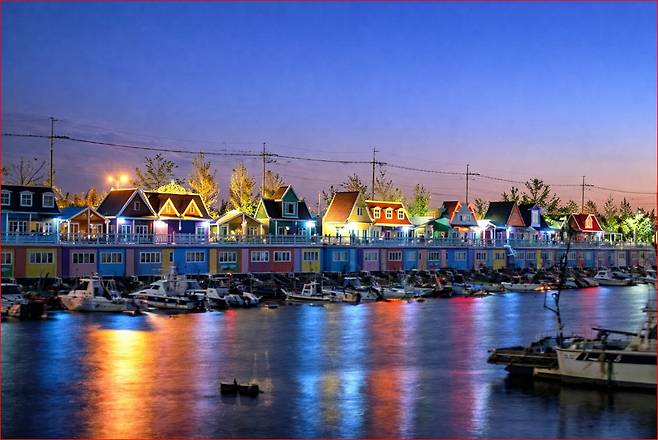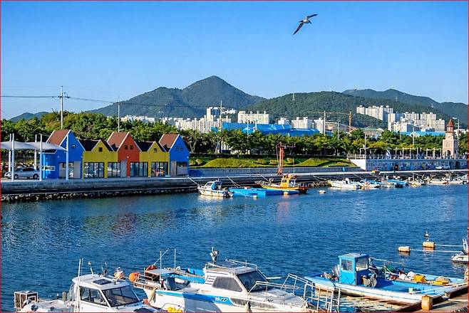 ‘ㄷ’ 자형 포구가 그려내는 입체적인 산책로 포구에 도착하면 형형색색의 표지판이 가장 먼저 여행자를 반깁니다. 포구의 지형은 깜찍한 안내도에 그려진 대로 ‘ㄷ’ 자 모양으로 굽어 있는데, 이 길을 따라 천천히 걷다 보면 좁고 긴 바다 위에 떠 있는 배들이 마치 외국 휴양지에 온 듯한 착각을 불러일으 킵니다. 쾌청한 하늘 아래 형광색으로 빛나는 건물들은 차가운 공단 지역의 이미지를 지우고, 방문객들에게 생동감 넘치는 첫인상을 건넵니다.
