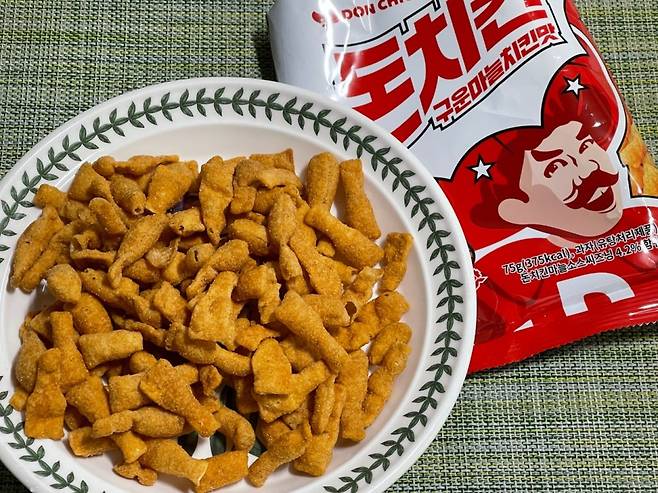 돈치킨 구운치킨마늘맛은 한 입 먹자마자 간장마늘치킨맛이 강하게 입안을 맴돌아요. 과자는 바삭하지 않고 약간 눅눅해요.