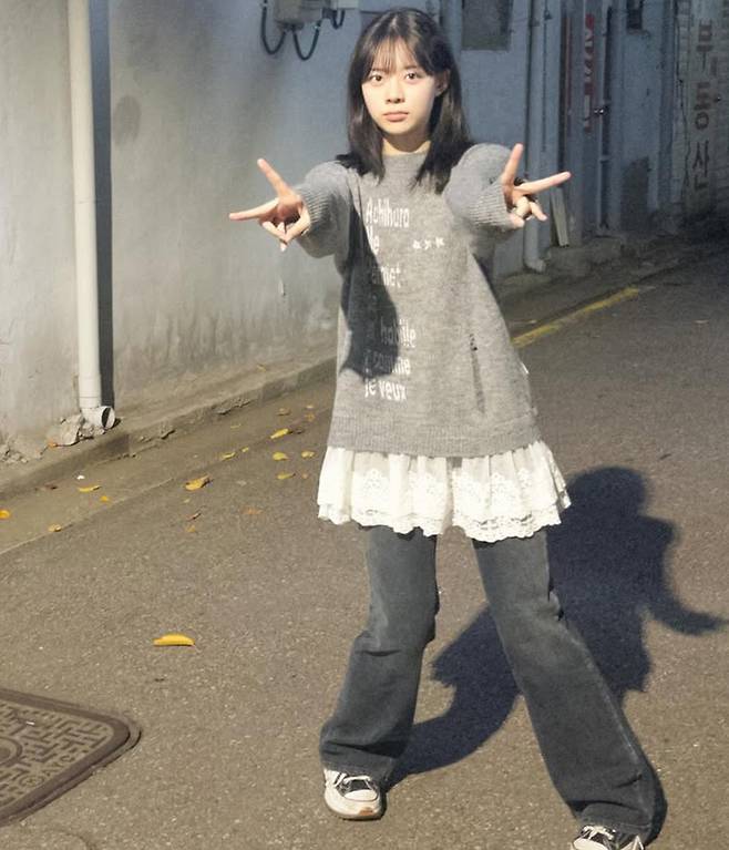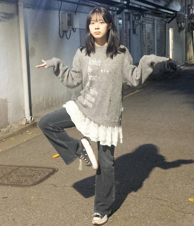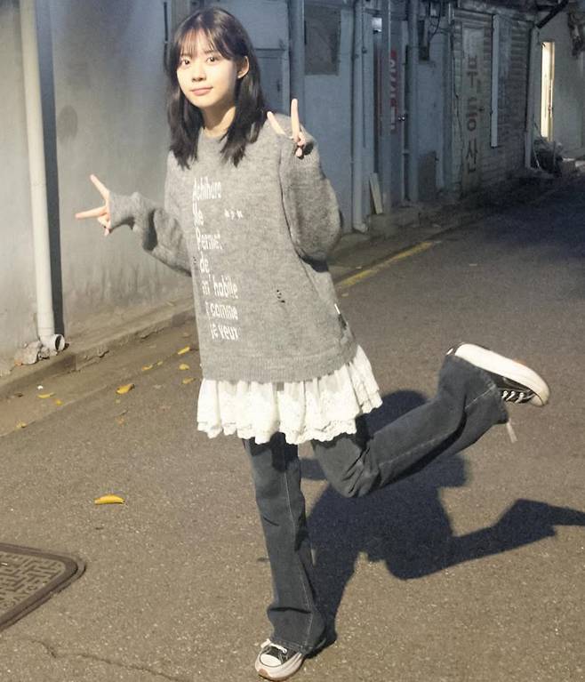 헐렁한 회색 니트에 레이스 원피스를 레이어드해 만든 실루엣이 사랑스럽게 흘러가고, 아래로 갈수록 워싱 데님이 무드를 차분하게 잡아줍니다.