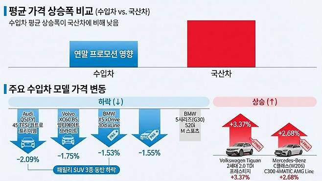 수입차 평균 상승률은 0.38%로 국산차보다 제한적이었다. 연말 신차 할인 프로모션의 영향이 이어지면서 일부 인기 차종의 중고차 가격이 눌린 것으로 보인다. 특히 패밀리 SUV에서는 하락세가 두드러졌다.