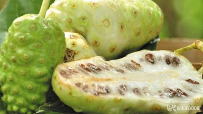 열매는 울퉁불퉁한 오이처럼 생겼고, 익으면 흰색 반투명 상태로 무르익는다. 생으로는 먹기 어렵다. 손에 쥐기만 해도 진한 냄새가 묻는다. 하지만 하와이, 폴리네시아 등지에서는 수천 년 전부터 기침, 피부질환, 소화장애, 고혈압 완화 등에 쓰여 이 열매를 즙 내서 마셨다.