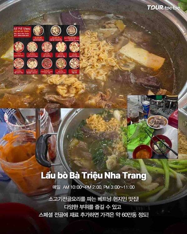 나트랑 여행 중 나트랑 현지인 비중이 높은 소고기 전골 전문점입니다. 여러 부위의 소고기를 선택해 끓여 먹는 방식이며, 국물이 진하지만 부담스럽지 않아 한국인 여행객에게도 평이 좋은 편입니다. 재료를 추가해도 가격이 크게 오르지 않아 가성비 면에서도 만족도가 높습니다.