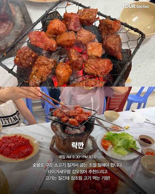 숯불 위에서 직접 고기를 구워 먹는 방식의 식당입니다. 불 조절이 쉽지는 않지만 그만큼 현지스러운 식사 경험을 할 수 있습니다. 고기와 함께 타이거새우를 곁들이는 조합으로 많이 먹습니다. 나트랑 방문 예정이라면 꼭 나트랑 맛집 지도에 추가해야할 필수 방문 나트랑 맛집입니다.