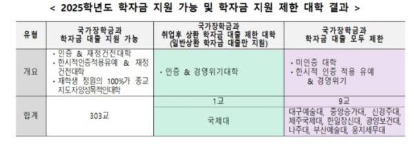 기관평가인증 결과가 ‘(조건부)인증 또는 한시적 인증적용 유예’이고 재정진단 결과가 ‘재정건전 또는 자발적 구조개선 이행계획 통과’인 경우에만 2025학년도 1년간 국가장학금·학자금대출을 지원받을 수 있다.