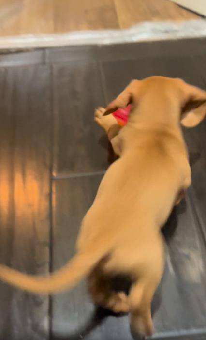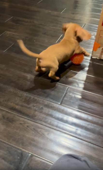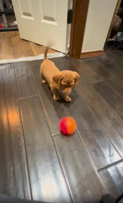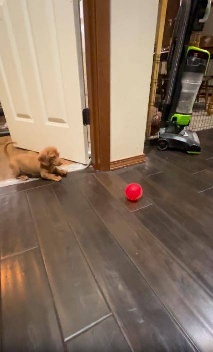 햇살이 포근히 들어오는 거실, 바닥에는 작은 공 하나가 놓여 있고 그 앞에는 조그만 닥스훈트 한 마리가 서 있습니다. 짧은 다리에 긴 몸을 가진 이 귀여운 강아지는 지금 세상에서 가장 신기한 물건을 마주한 듯한 표정이에요. 그 물건은 다름 아닌 ‘공’. 아직 이 강아지에겐 낯설고도 낯선 존재입니다.