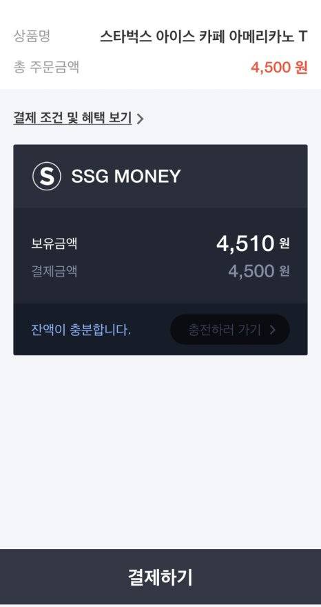 스타벅스 기프티콘을 구매하려면 가지고 있는 ssg머니 4500원을 ssg페이로 바꿔야 해요.