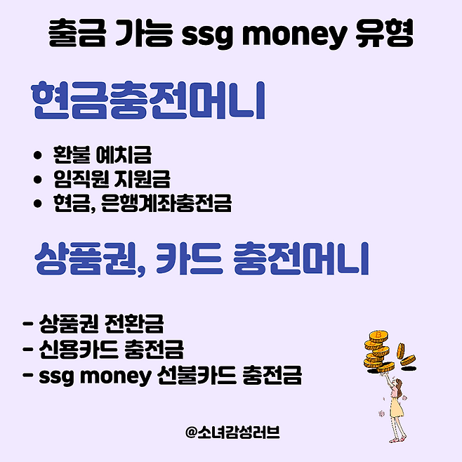위의 표와 같이 환불 예치금, 임직원 지원금, 현금, 은행계좌충전금, 상품권 전환금, 신용카드 충전금, ssg money선불카드 충전금은 현금화가 가능해요.