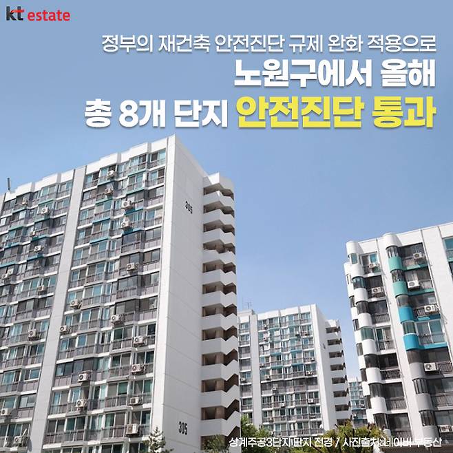 이렇게 올 들어 노원구에서 안전진단 기준을 통과해 재건축 첫 단계를 넘긴 단지들이 속속 등장하는 이유는 정부의 재건축 안전진단 규제 완화 덕분입니다. 정부는 지난해 12월 ‘재건축 안전진단 합리화 방안’에 따라 구조안정성을 50%에서 30%으로 낮추고 주거환경 점수와 설비 노후도 점수를 각각 15%, 25%에서 모두 30%으로 확대했습니다.