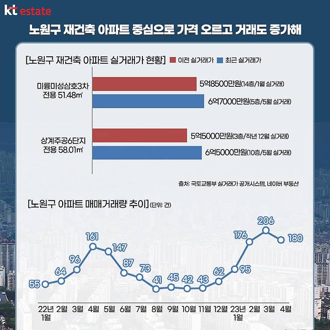 노원구 아파트 거래량도 눈에 띄게 늘어나고 있습니다. 한국부동산원 자료에 따르면, 올 4월 노원구 아파트의 매매거래량은 180건으로 집계됐습니다. 지난해 8월 41건으로 떨어졌다가 올 2월 176건으로 100건대를 회복했고, 3월에는 206건으로 200건을 넘기기도 했습니다. 재건축이 확정된 단지가 늘어날수록 거래량은 더욱 늘어날 전망입니다.