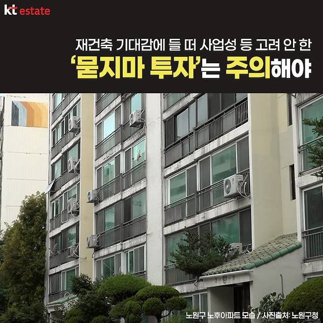 한편, 노원구에 재건축 안전진단을 통과하는 단지가 속속 등장하면서 투자를 고민하는 이들도 지금보다 늘어날 것으로 보입니다. 하지만, 재건축 아파트의 미래 가치만 보고 투자하기엔 여러 가지 고려해야 할 점이 많은데요.