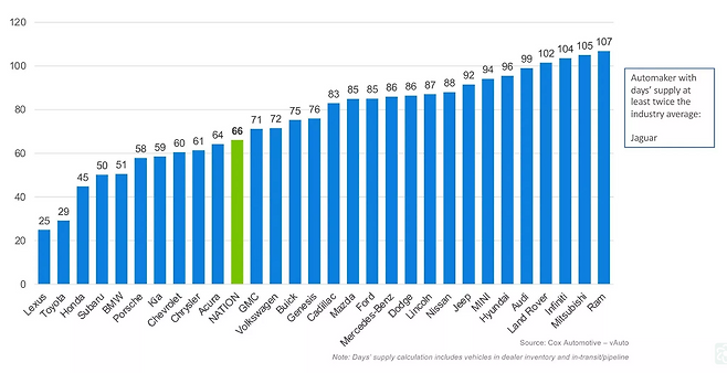 브랜드별 차이도 뚜렷했다. 토요타와 렉서스는 공급 일수가 한 달 이내인 반면, 랜드로버·인피니티·미쓰비시·램·재규어 등은 100일 이상 재고를 보유 중인 것으로 나타났다.