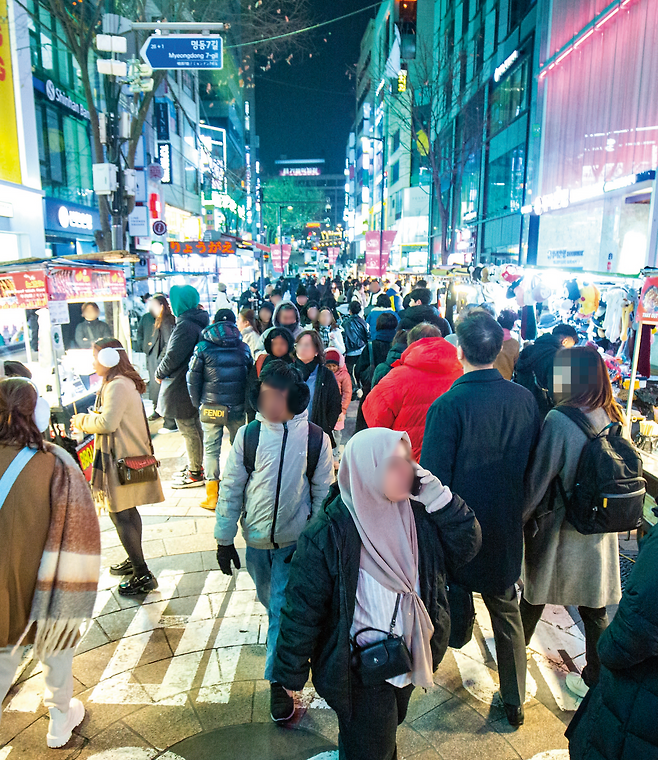 명동이 ‘K-관광 1번지’의 명성을 되찾았습니다. 코로나19 팬데믹의 직격타를 맞아 공실률이 50%에 달했던 명동은 외국인 관광객 유입에 힘입어 ‘K-푸드’, ‘K-화장품’, ‘K-팝’ 등을 내세운 ‘K-쇼핑 1번지’로 화려하게 부활했습니다. 먹거리 노점마다 대기줄이 이어지고 패션잡화점은 외국인 손님으로 넘칩니다. 올리브영 명동타운점은 직원들이 외국어로 고객을 맞는 ‘글로벌 특화 매장’으로 캐리어를 들고 움직이는 관광객들이 쉴 수 있는 좌석까지 마련돼 있습니다. 20대 미국인 남성은 “미국에서도 온라인으로 주문할 수 있는 화장품이지만 한국에서 사는 것이 더 저렴하고 종류가 다양하다. 영어가 통하니 쇼핑이 어렵지 않다”고 말했습니다.