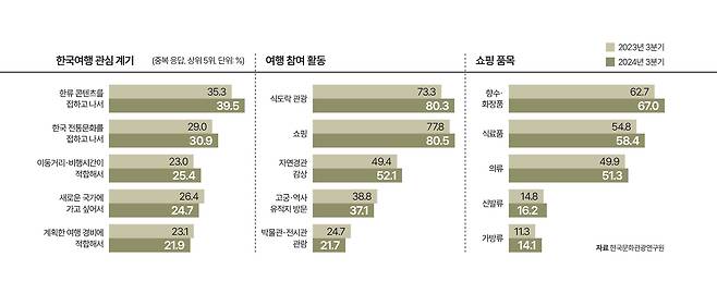 이러한 풍경은 한국문화관광연구원이 최근 발표한 ‘2024 외래관광객조사 3분기 잠정치 보고서(2024 외래관광객조사)’에서도 확인할 수 있습니다. 만 15세 미만·91일 이상 체류 여행객을 제외한 방한 외국인 여행객을 대상으로 이뤄진 조사에서 응답자들은 한국 방문 목적으로 ‘여가·위락·휴식’을 가장 많이(67.4%) 꼽았습니다. 가장 좋았던 방문지 1위는 2023년 3분기·2024년 3분기 모두 ‘명동(16.2%)’이었습니다.