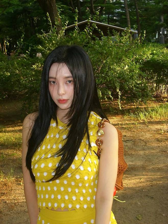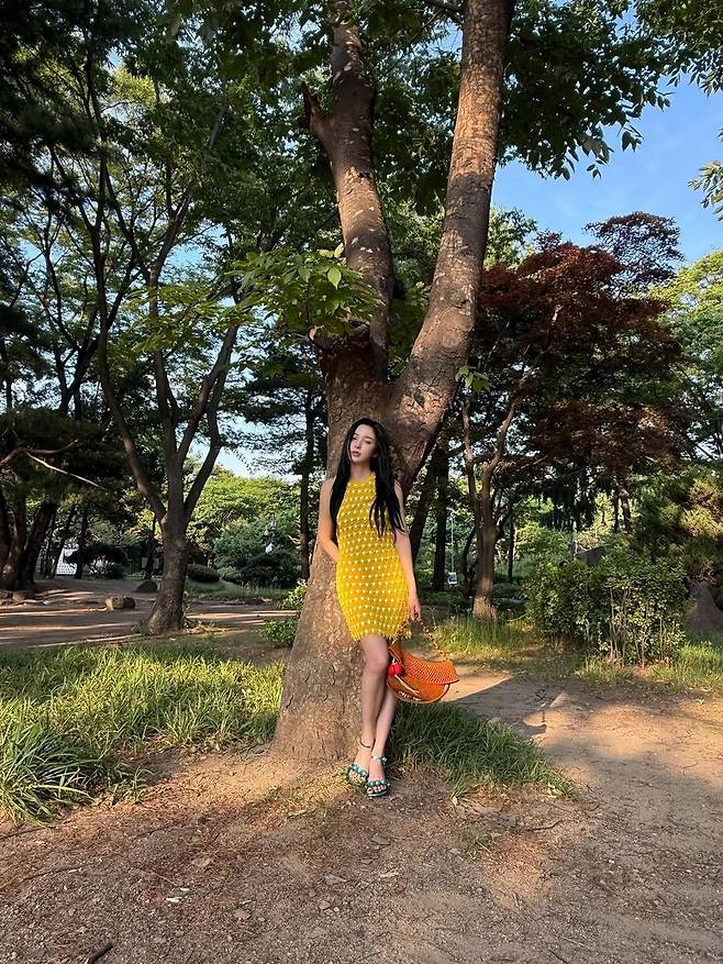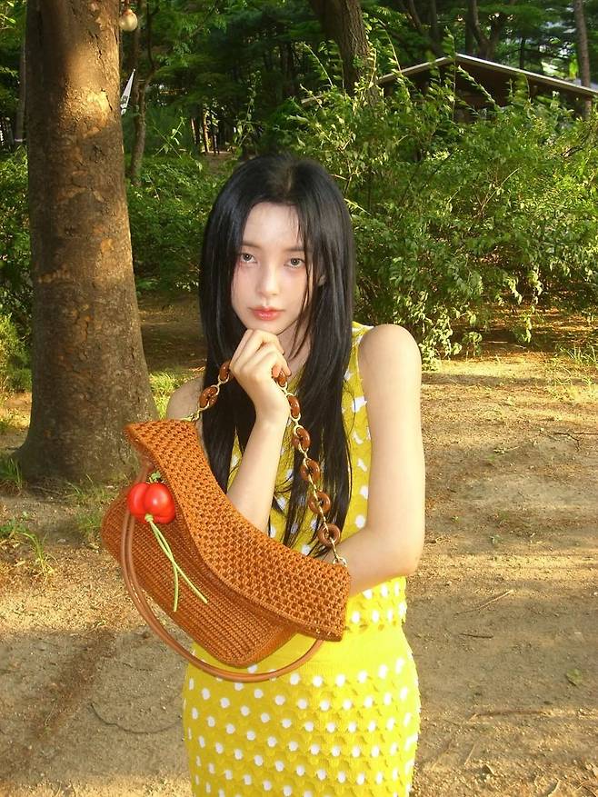 신수현이 선택한 옐로 원피스는 입체적인 화이트 도트 디테일이 특징으로, 발랄하면서도 여성스러운 무드를 동시에 자아낸다. 몸에 슬림하게 핏되는 실루엣이 그녀의 늘씬한 라인을 더욱 돋보이게 하며, 깊은 숲속의 배경과도 완벽하게 어우러져 마치 화보 같은 장면을 연출했다. 여기에 따뜻한 브라운 톤의 라탄백을 매치해 자연 친화적이고 감각적인 감성을 더했다. 체리 모양의 참 장식은 상큼한 포인트로 작용하며 룩에 생기를 불어넣는다.
