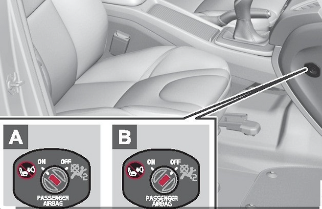 조수석에 '뒤보기 카시트'를 설치해야 한다면, 먼저 숨겨진 에어백 스위치를 찾아, 자동차 키를 이용해 'OFF' 위치로 돌려줍니다.