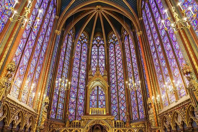 루이 9세가 그리스도의 가시관을 비롯한 기독교 유물 컬렉션을 소장하기 위해 건축을 의뢰한 이 예배당에서 가장 눈에 띄는 것은 15m 높이의 아름다운 스테인드글라스 창문인데요. 이 창문은 15가지의 밝은 색상으로 구성되어 있으며, 구약과 신약의 장면을 생생하게 묘사하고 있습니다.