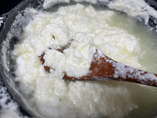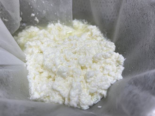 충분히 덩어리가 응고되었으면 면포나 시트지에 끓인 우유를 부으세요. 그럼 유청은 분리되어 덩어리만 남게 됩니다.