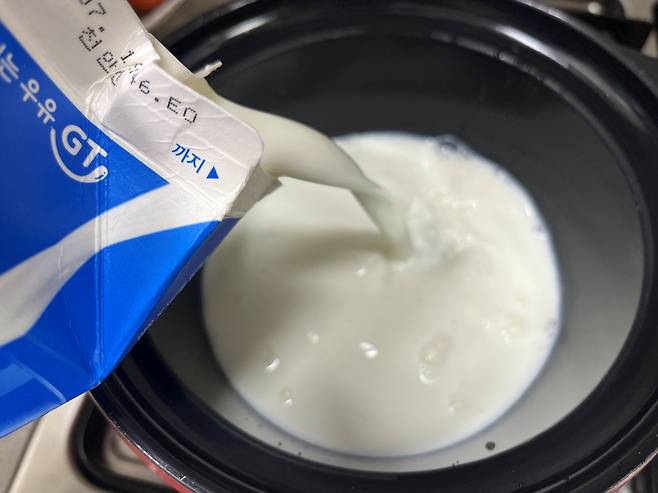유통기한 지난 우유 1L를 냄비에 넣고 중불에서 뭉근하게 데워 주세요.