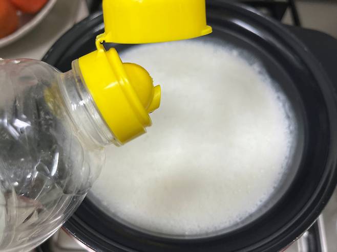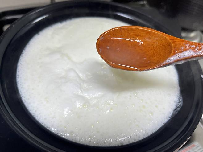 이때 바닥이 눌어붙지 않도록 수저나 주걱으로 천천히 저어주세요. 끓어오르기 직전에 미세한 거품이 보일 때 불을 끄세요!