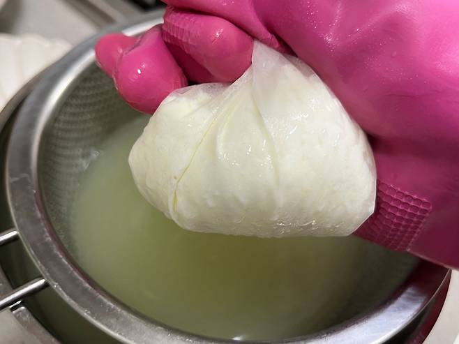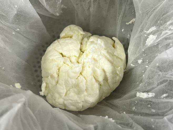 면포를 꽉 짜면 유청은 빠지고 덩어리 진 치즈만 남게 되는데요. 물을 더 확실하게 빼고자 한다면, 무거운 그릇 등을 올려서 1~2시간 두세요.