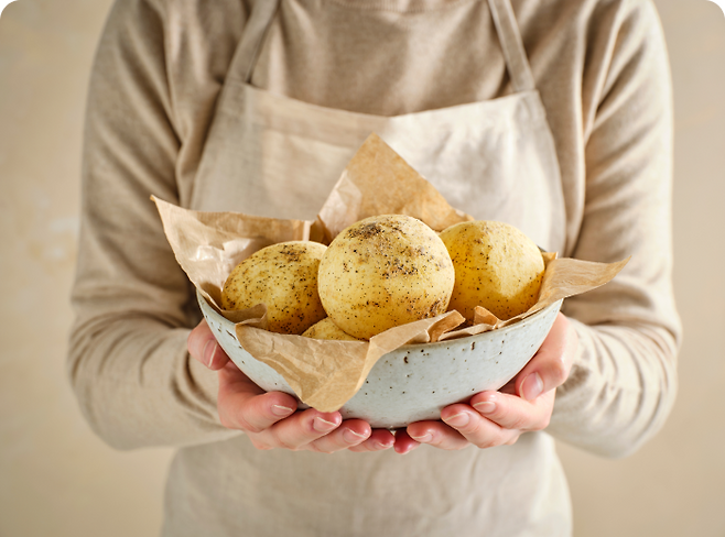 여러 시도 후에, 홍상기 셰프님께 “감자 본연의 맛과 특색을 살린 감자빵을 만들고 싶다”고 부탁드렸어요. 다양한 품종의 감자를 써보고, 익히는 방식도 달리하며 레시피를 다듬었죠. 지금의 감자빵 레시피는 초기와 많이 다르지만, 2가지의 토종 감자 원물이 듬뿍 들어간 감자 모양의 감자빵이 이렇게 탄생했습니다. 드디어 단순한 제품이 아니라, 종자의 다양성을 지키면서도 농촌의 고부가가치 제품이 될 수 있는 길을 찾은 기분이 들더라고요.