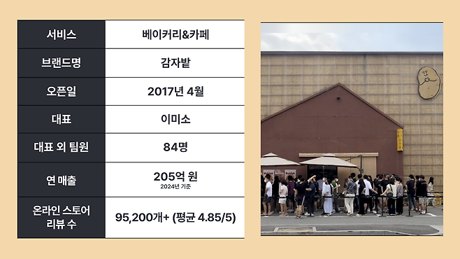 감자밭이 브랜드를 론칭한 첫해, 매출이 무려 25억 원에 달했다고 합니다. 그리고, 지금은 205억 원이라는 어마어마한 매출을 만들고 있죠. 로컬 브랜드로서 이렇게 빠르게 성장할 수 있었던 원동력은 무엇이었을까요? 감자빵이 단숨에 사랑받은 비결을 파헤쳐 보았습니다.