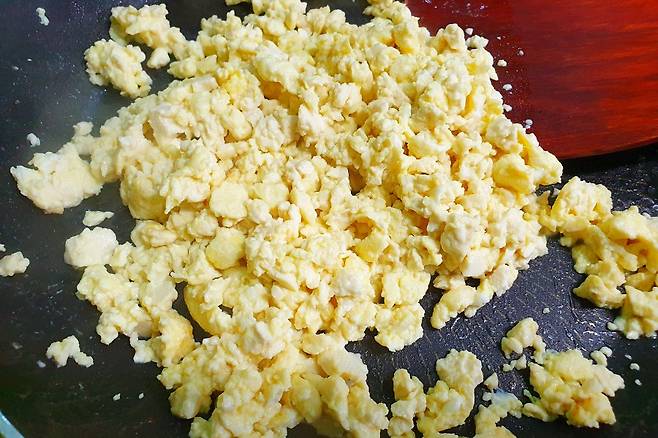 휘휘 저어가며 스크램블을 만듭니다. 물기가 날라가고 몽글몽글해질때까지 저어주다가 후추 톡톡 뿌려 마무리 합니다.