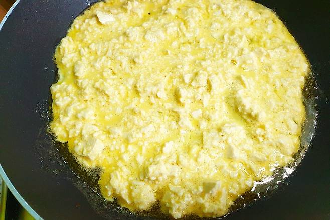 두부계란물을 팬에 넓게 펴 주세요.