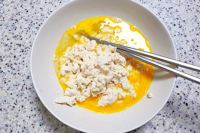 으깬 두부를 풀어논 계란물에 섞어주시고요. 소금 1꼬집 넣고 잘 섞어 줍니다.