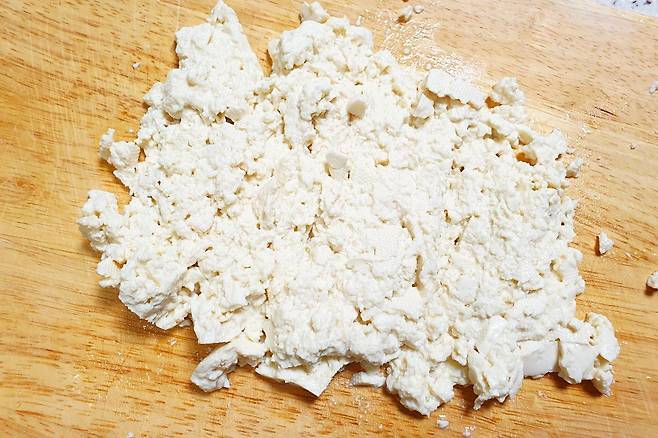 두부 1/2모를 칼을 대고 아래로 누르면서 부드럽게 으깨 줍니다.