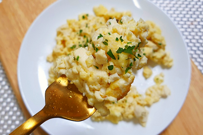 계란과 두부의 조합으로 영양 2배가 되는 두부 스크램블 완성입니다. 여기에 베이컨과 빵을 노릇하게 구워내면 브런치로도 손색 없습니다.