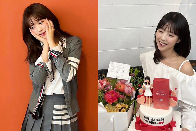 다른 사진에서는 한강변을 배경으로 화이트 반팔 니트에 하늘색 계열의 스커트를 매치한 지예은의 모습이 눈에 띈다.