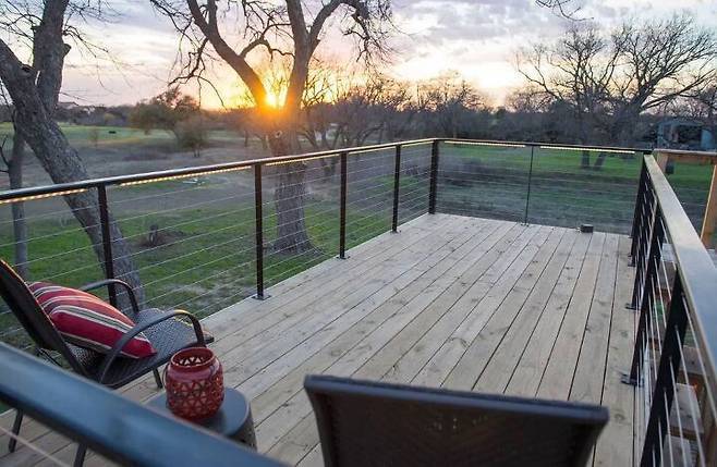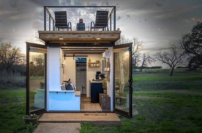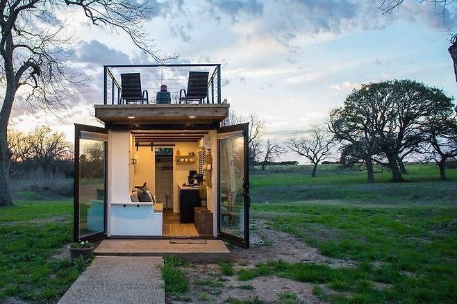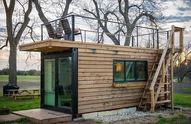 이 텍사스 컨테이너 하우스는 일반적으로 버려지는 위쪽 공간을 멋지게 활용했다. 작은 계단을 외부에 만들고 목재로 상부를 마감해 작은 아파트의 발코니 정도 되는 공간을 만들었다.