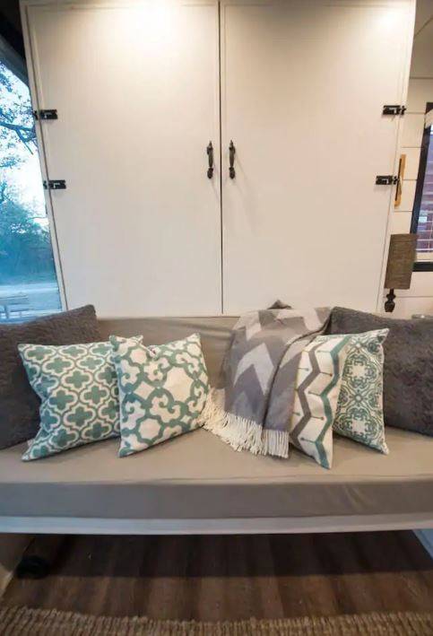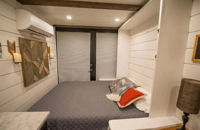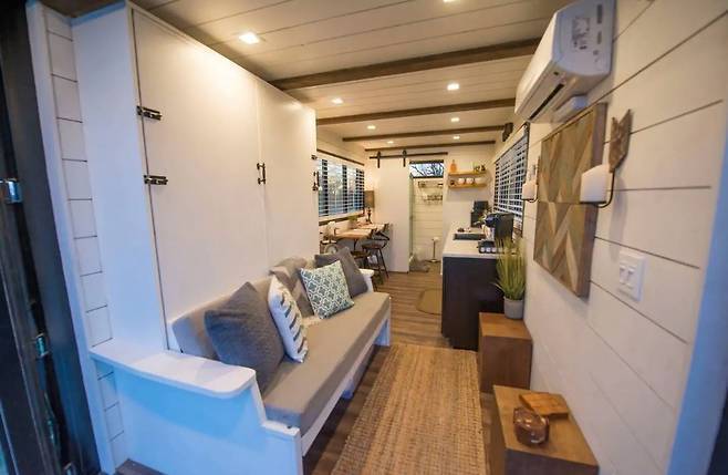 구조는 단순하다. 문 쪽부터 리빙 공간, 주방, 샤워실 순으로 배치했다. 최소한의 사이즈로 구성하고 되도록 많은 창을 넣었다. 침대는 소파가 자리한 뒤쪽 벽에 설치해 취침 시에 내려서 사용하도록 만들었다. 침대가 내려와도 다른 공간을 사용하는 데는 큰 무리가 없다.