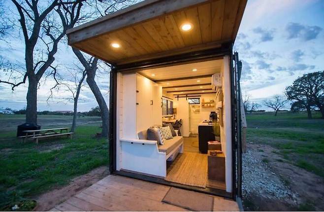 텍사스 어느 시골 마을에 있는 이 컨테이너 박스는 주인이 새로운 디자인을 적용하면서 가족과 여행자를 위한 스틸 구조의 휴식지로 재탄생했다.