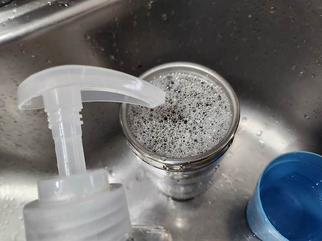 텀블러 뚜껑을 닫고 1~2분간 흔들어줍니다. 이 과정에서 틈새에 남아 있는 찌든 때가 분리됩니다.