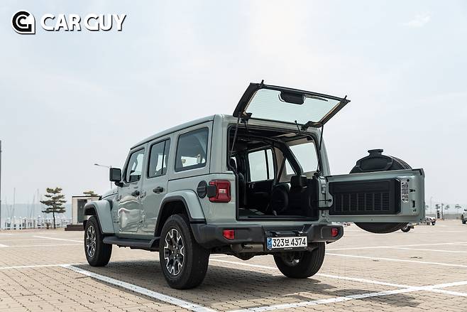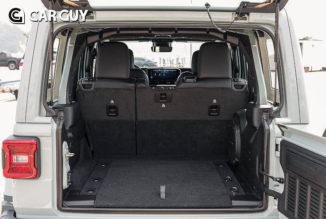 트렁크에 별도 스페어 휠·타이어를 적재한 만큼 트렁크는 옆으로 개폐된다. 작은 짐을 넣고 뺄 때, 각도를 세밀하게 조절할 수 있어 의외로 편리하다. 트렁크에 탑재된 알파인 사운드 시스템은 트렁크 공간에 소폭 손해를 끼치지만 랭글러 사하라 파워탑에 최적화된 소리를 내준다.